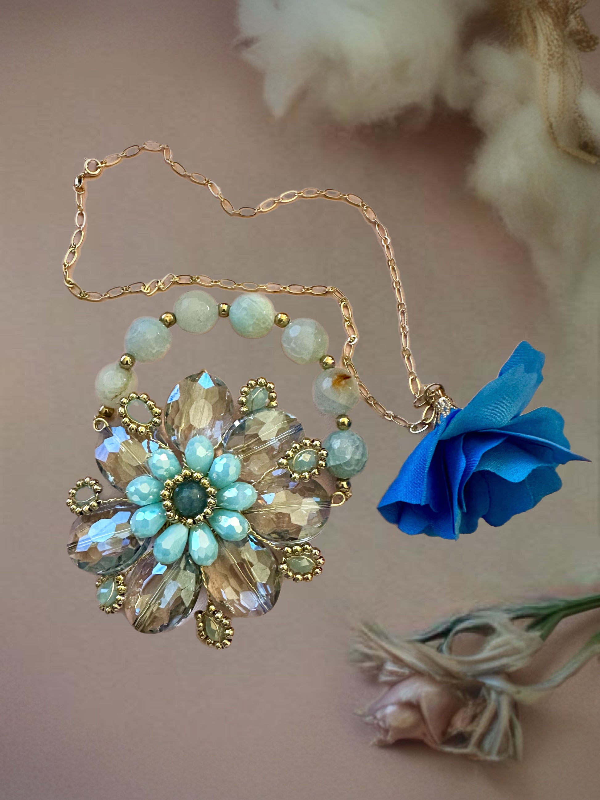 Radiant and refreshing, the Azure Bloom Set brings together a handcrafted 14k gold-plated necklace with a delicate fabric pendant and a dazzling floral bracelet. Designed with intricate gold-plated wire work, this set features aquamarine stones, luminous quartz, and sparkling blue crystals that bloom into a captivating flower centerpiece. The bold blue fabric accent adds a modern touch of elegance, balancing softness with sparkle.