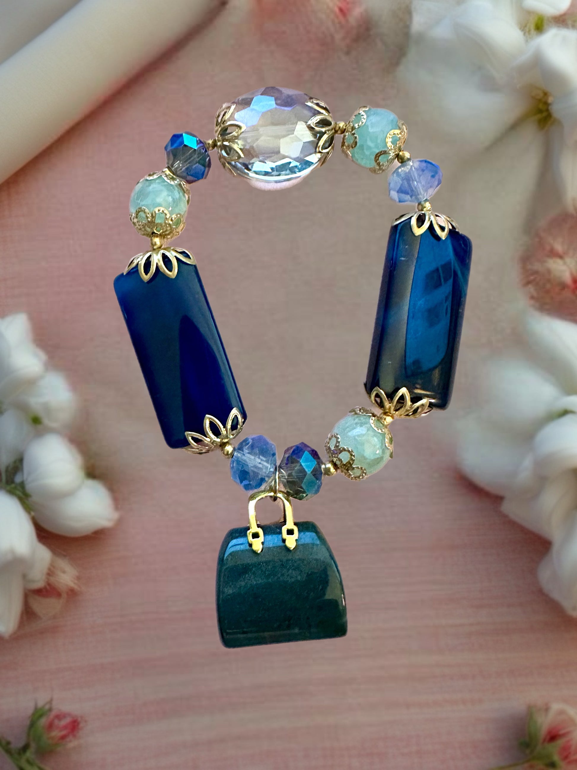 Step into a world of tranquil elegance with our Blue Mirage Bracelet. This handcrafted beauty showcases a sculpted mini handbag pendant in lapis lazuli—symbolizing wisdom and truth—anchored by a dazzling mix of iolite, shimmering crystals, and serene blue quartz stones. Gold-plated filigree accents add a regal finish, while the vibrant shades of blue evoke ocean depth and celestial wonder. A perfect statement piece for dreamers, creators, and style enthusiasts alike.