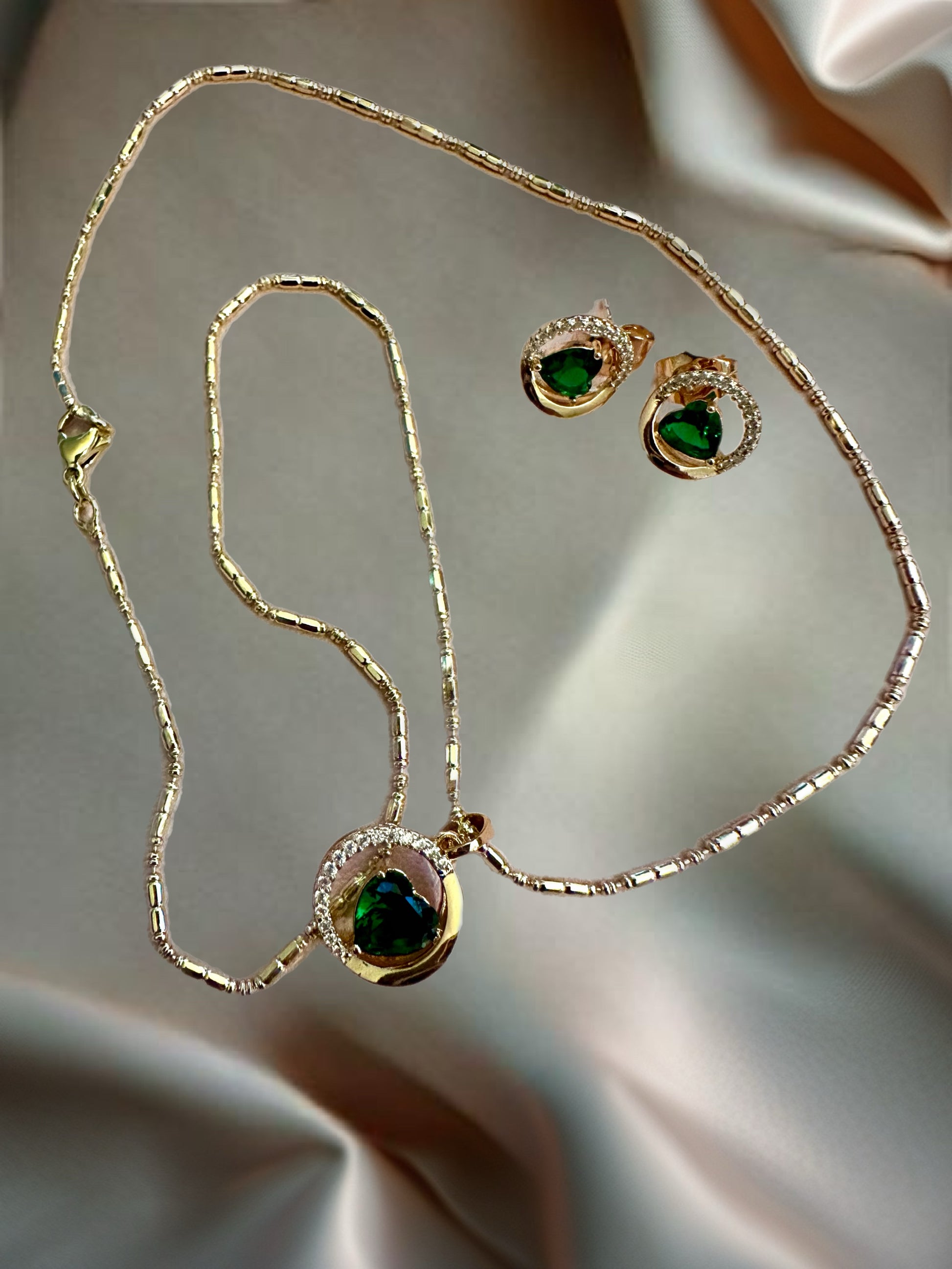 Elevate your elegance with the Emerald Embrace Set, a timeless pairing of sophistication and sparkle. This matching necklace and earring set features radiant emerald-green heart-shaped stones, symbolizing love and renewal. Each piece is gracefully framed with shimmering cubic zirconia accents and set in 14k gold-plated stainless steel for lasting beauty and durability.