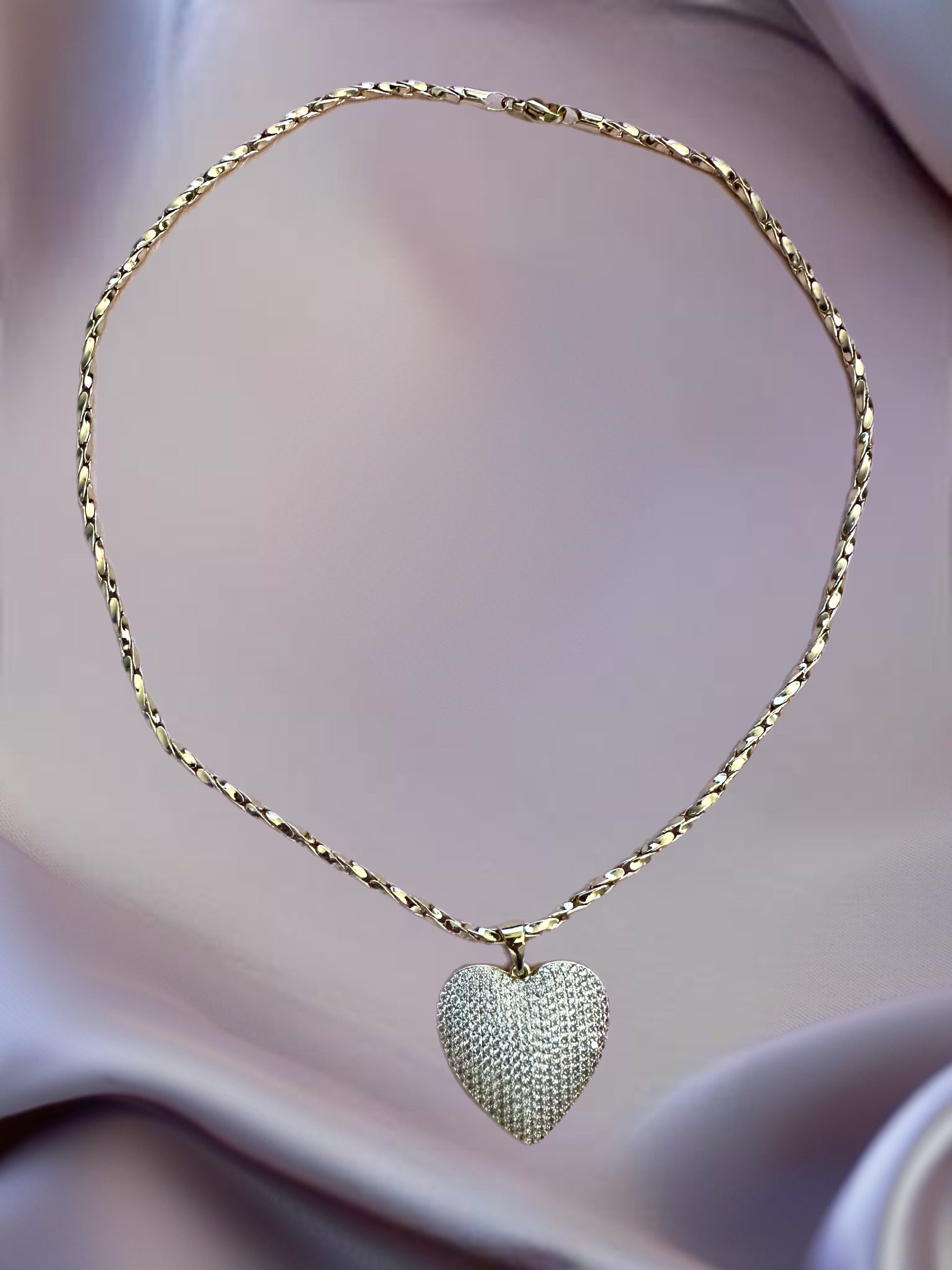 Fall in love with timeless elegance in the Eternal Spark Heart Necklace. Featuring a dazzling heart pendant encrusted with shimmering cubic zirconia, this piece radiates brilliance from every angle. The pendant hangs gracefully from a twisted 14k gold-plated stainless steel chain, blending durability with refined sophistication.