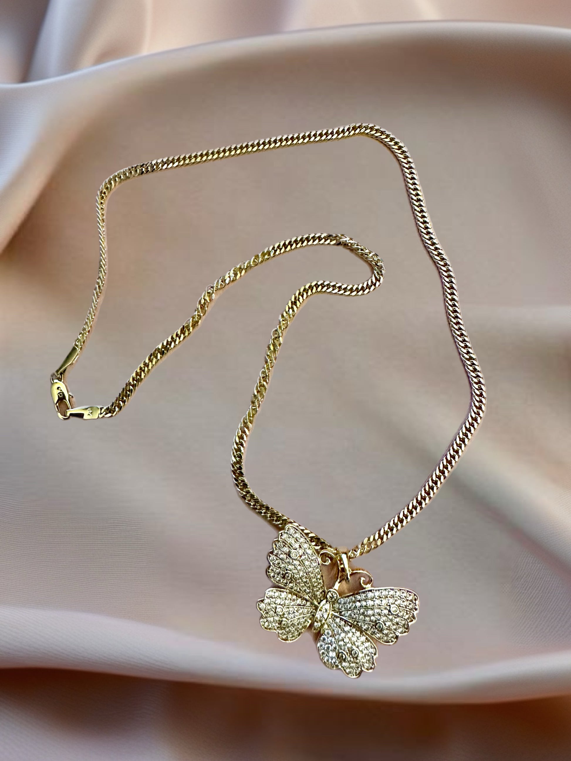 The Eternal Wings Necklace embodies freedom, beauty, and transformation. This stunning butterfly pendant sparkles with pavé-set cubic zirconia stones, each wing delicately crafted to capture the shimmer of light with every movement. Suspended on a twisted flat chain made from durable 14k gold-plated stainless steel, this necklace is both timeless and eye-catching.