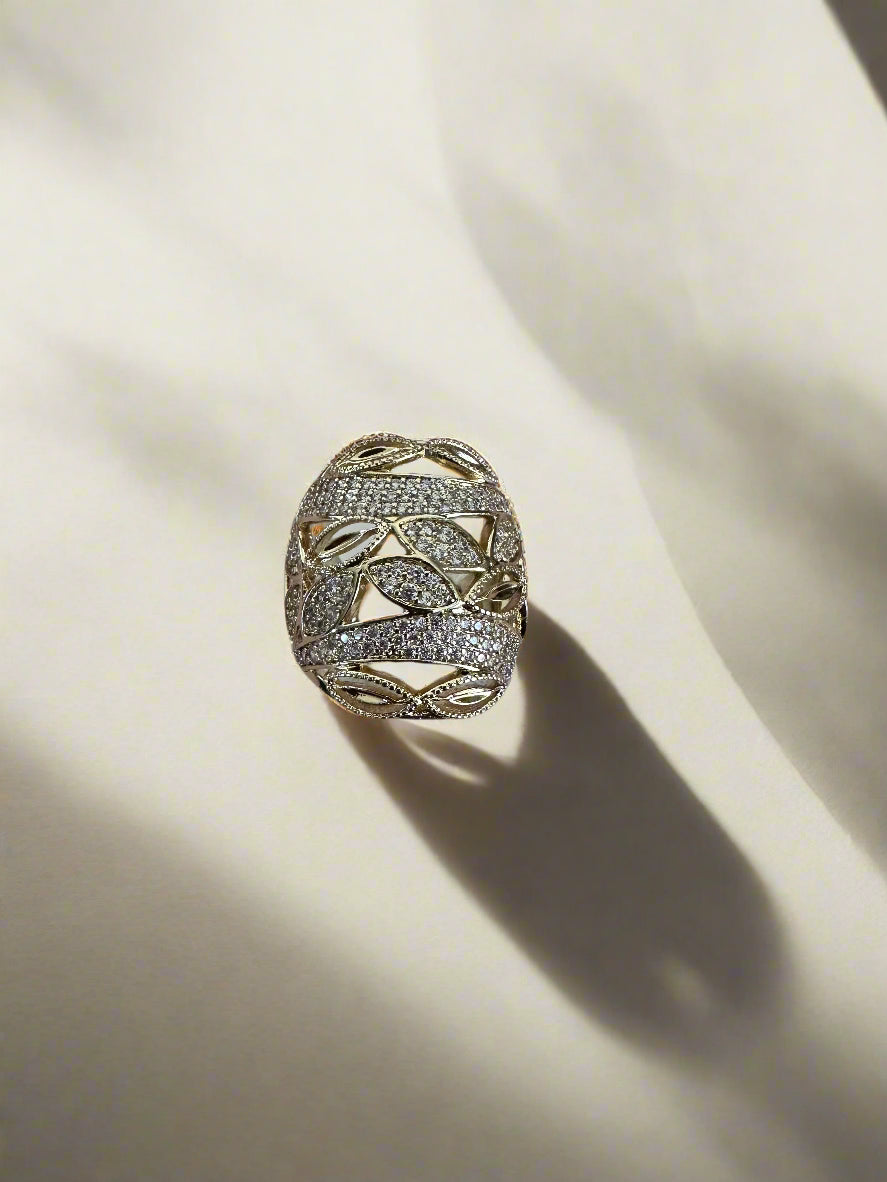 Inspired by the gentle descent of autumn leaves, the Falling Leaves ring features delicately crafted leaf motifs intertwined with shimmering white cubic zirconia insets. Set in lustrous 14k gold-plated stainless steel, this bold yet graceful piece brings organic beauty to a statement silhouette.