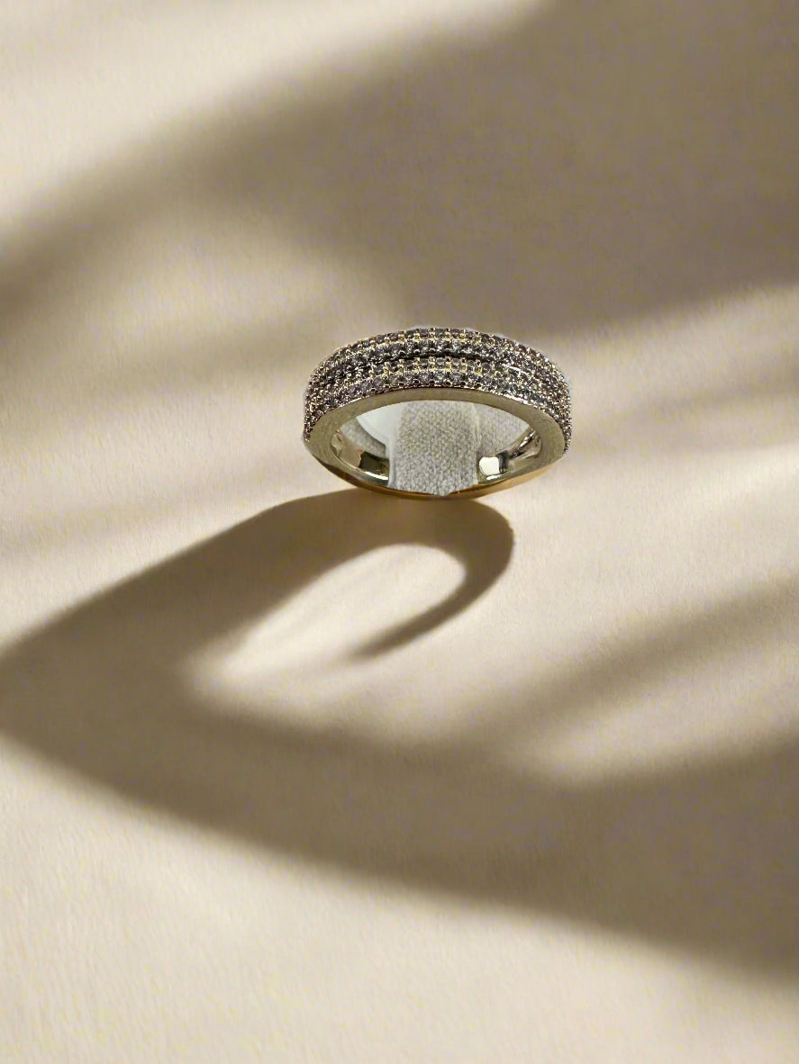 Get the look of two luxe rings in one with the Mock Double — a sleek and modern 14K gold-plated stainless steel band featuring three rows of brilliant white cubic zirconia stones. Designed to mimic the look of stacked rings, this elegant piece offers sparkle and sophistication with a minimalist twist.