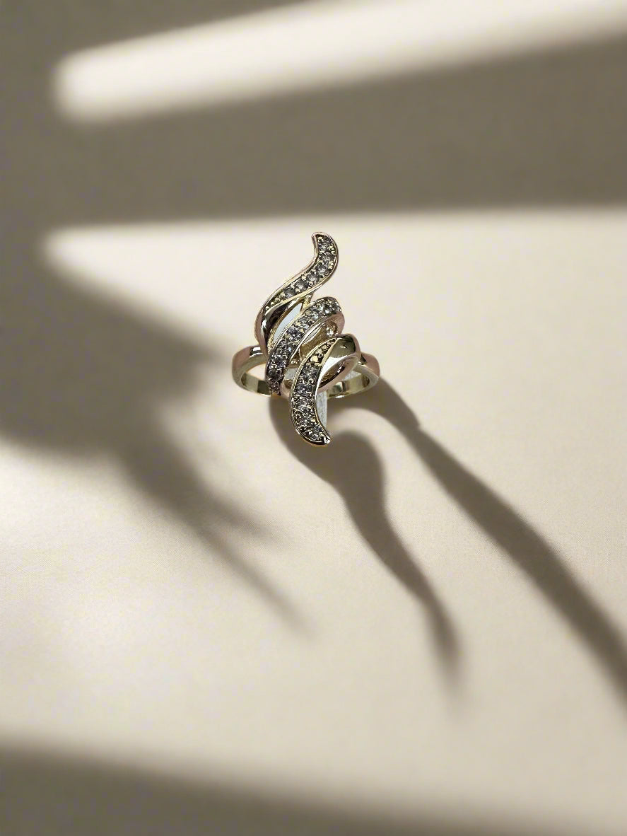 Inspired by the graceful flow of wind and water, the Shimmer Swirl ring captivates with its dynamic design. Crafted from 14k gold-plated stainless steel, this sculptural statement piece features curved bands lined with sparkling white cubic zirconia, creating a fluid, luminous silhouette from every angle. Bold yet wearable, it adds instant sophistication to any look.
