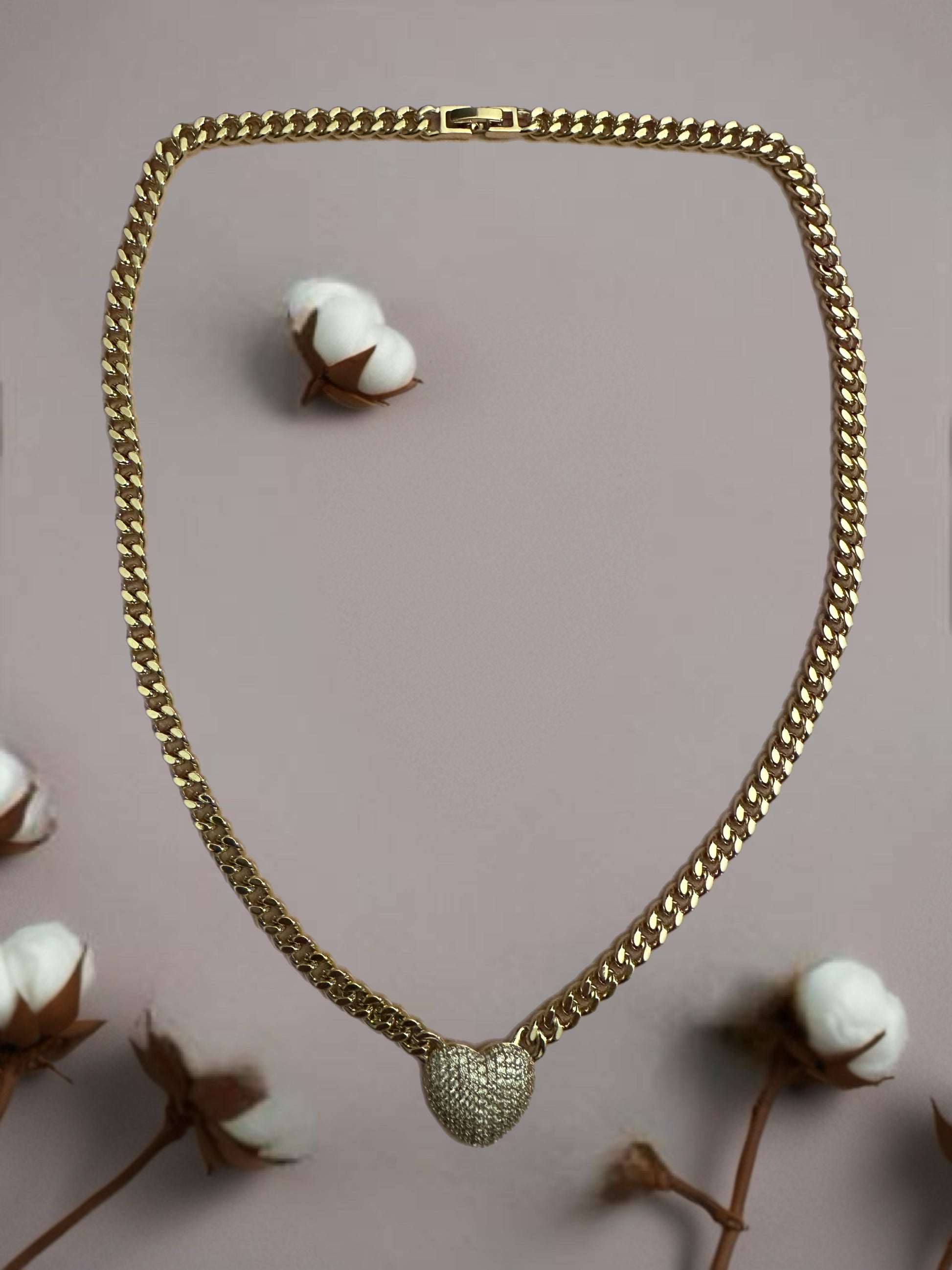 Bold meets romantic in our Sweet Armor Necklace — a stunning blend of edge and elegance. Crafted from durable 14k gold-plated stainless steel, this necklace features a classic Cuban chain silhouette adorned with a dazzling heart pendant encrusted in brilliant white cubic zirconia.