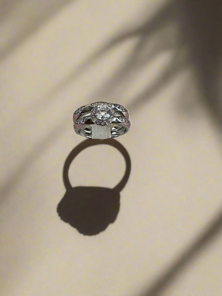 Celebrate classic beauty with The Traditional Set, a refined silver-plated stainless steel ring set that brings everlasting sparkle to your everyday or special moments. Featuring a brilliant round solitaire center stone surrounded by a halo of shimmering cubic zirconia, this set exudes grace and sophistication. Additional inset stones along the band add a touch of modern glam to a truly timeless silhouette.